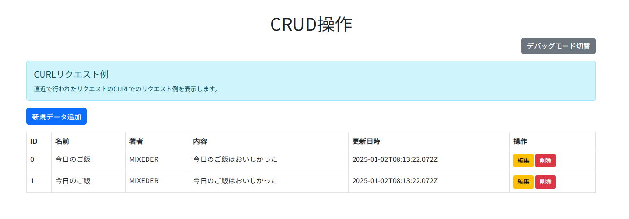 項目名は名前、著者、内容、更新日時と指定されています。(そのほかの項目で利用したい場合はAPIをご利用下さい)